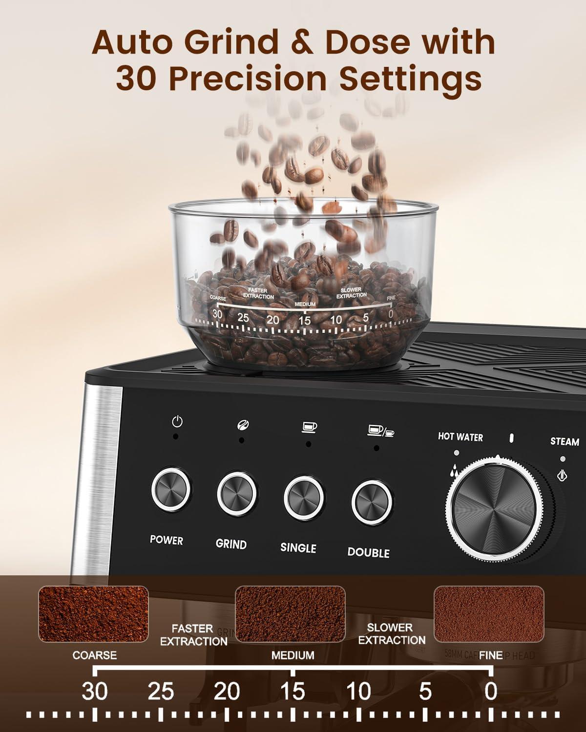 20 Bar Espresso Machine with Grinder & Milk Frother Steam Wand, 58mm Stainless Steel Coffee Maker, Expresso Coffee machines for Home and Café Use, Perfect for Cappuccino and Latte(Charcoal)