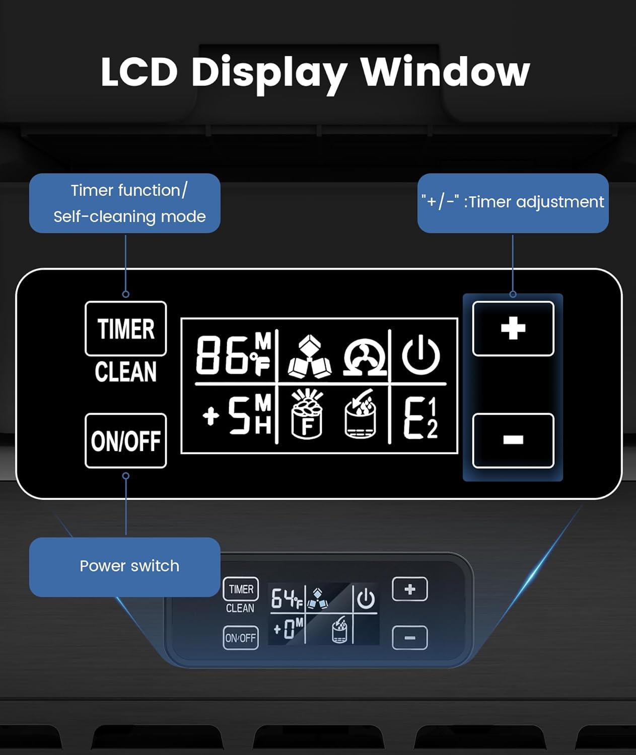 Simple and smart control panel & viewing window: No confusing buttons! The intuitive LED display allows you to easily start ice making and cleaning mode. With the visual design, you can directly observe the ice making process and check the ice quantity without opening the top cover frequently.