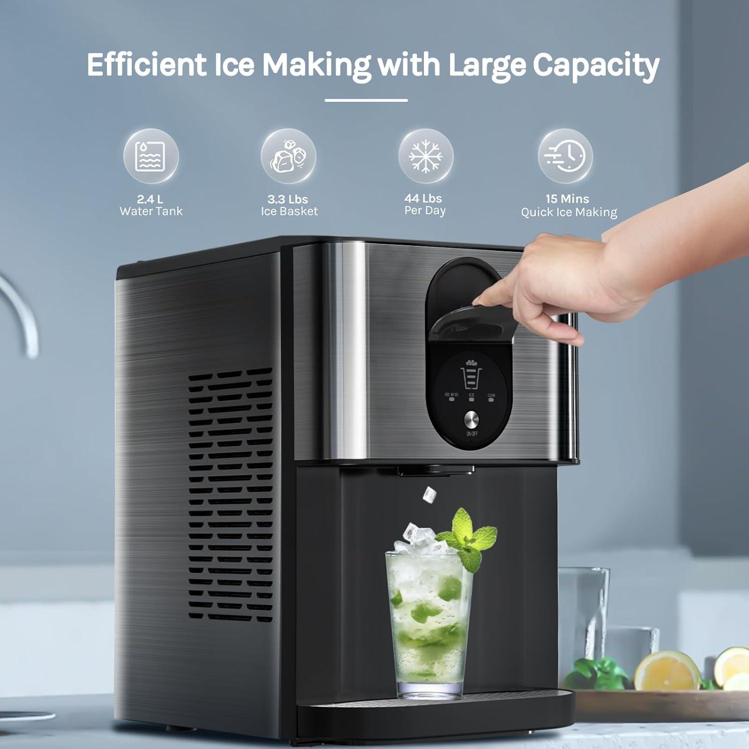 【Rapid & Efficent Nugget Ice Making】Our countertop ice maker with removable 2.4L rear water reservoir can make up to 44 lbs of chewable nugget ice daily. From “no ice” to your first batch in just 15-20 minutes. With upgraded insulation, these ice cubes stay frozen for up to4-5 hours, ensuring you're never without ice, ensuring continuous and rapid ice-making.