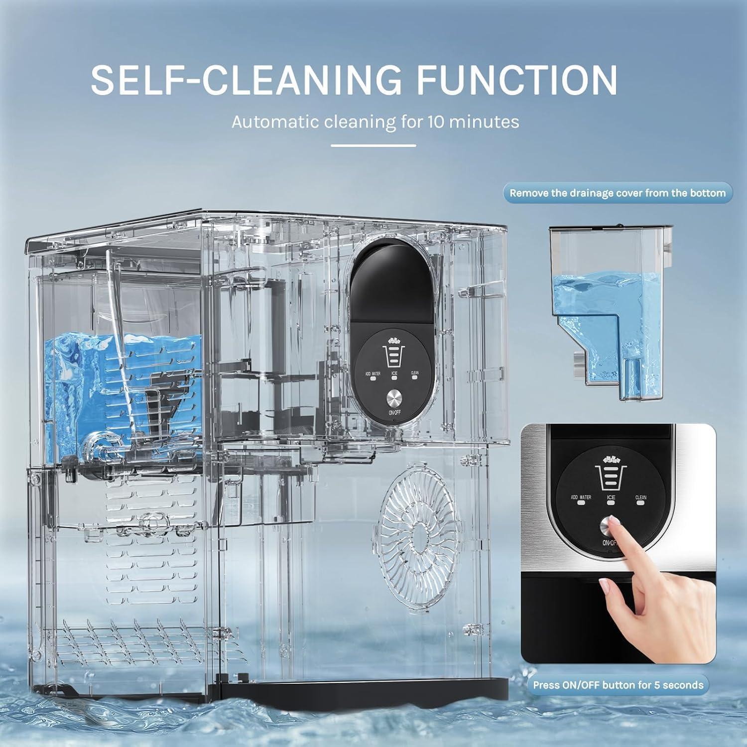 【Effortless Self-cleaning】The one-touch self-cleaning cycle keeps your ice maker fresh and low-maintenance. Bid farewell to laborious cleaning tasks. A mere 5-second press of the ON/OFF button activates the countertop ice maker machine's self-cleaning feature. In just 10 minutes, a brand-new ice maker emerges, ready to serve you with fresh ice.