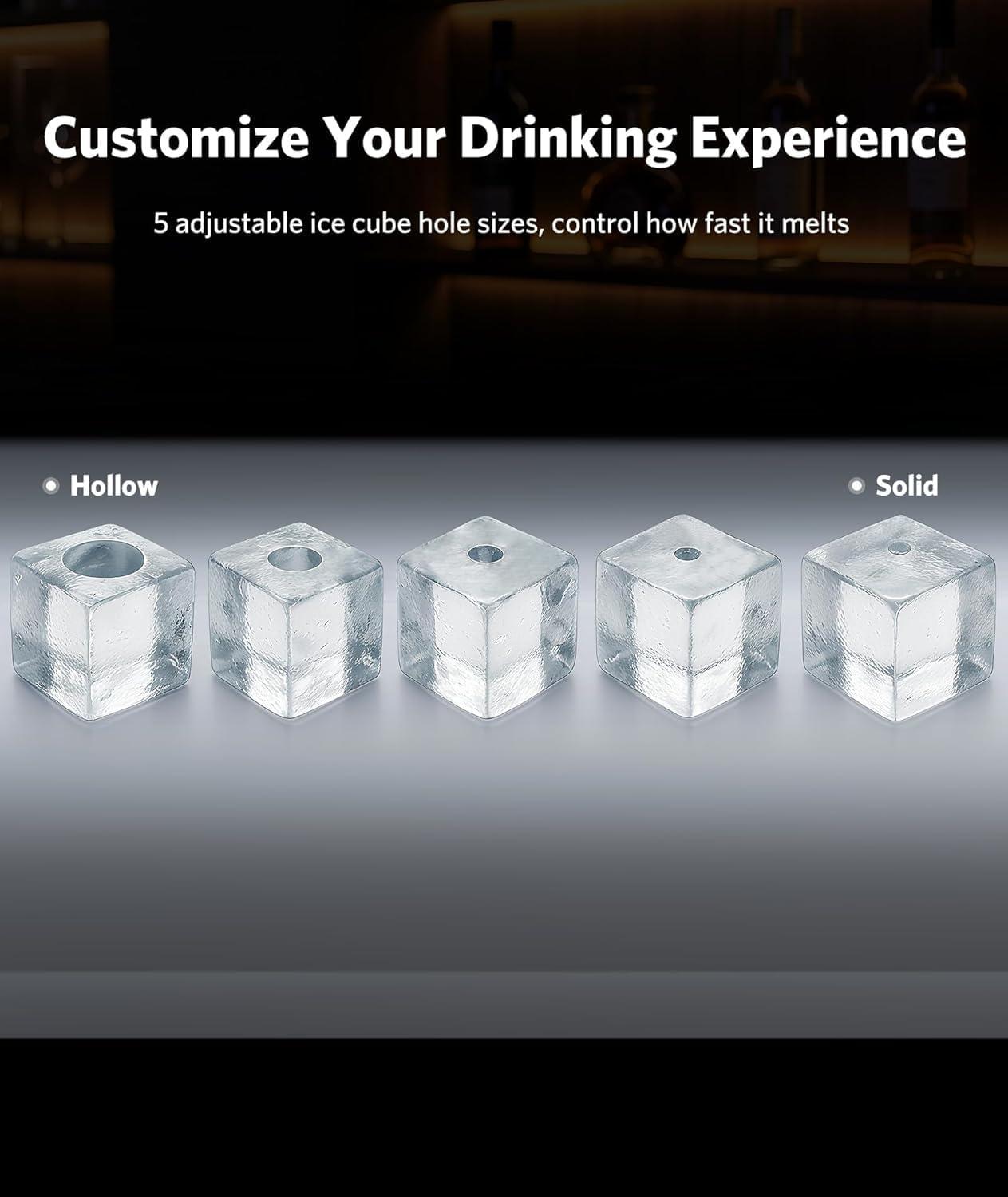【5 Ice Cube Sizes】 The Whiskey Ice Maker offers 5 different ice cube sizes.Adjust the ice-making time on the cube ice maker for thin, medium, or thick cubes. The longer the ice-making time, the thicker the ice cubes.
