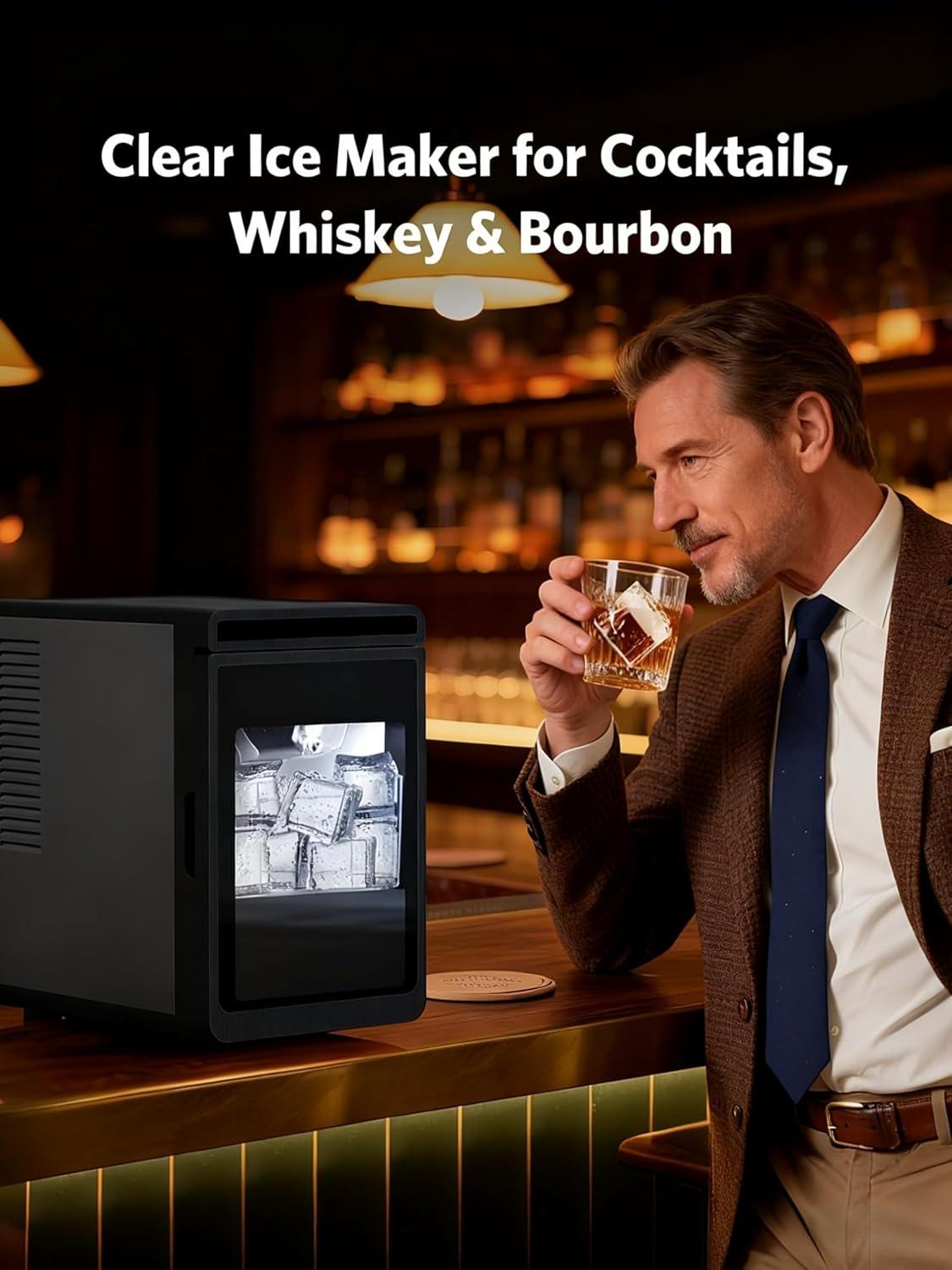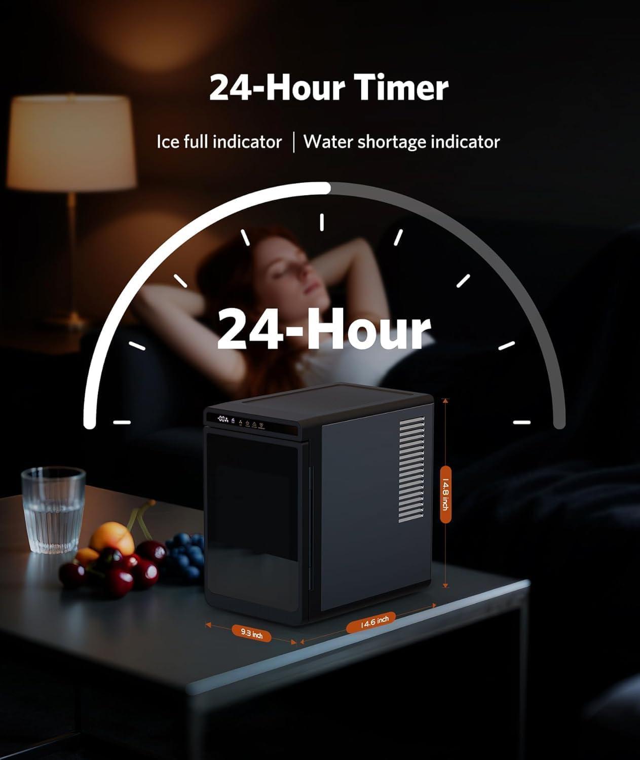 【24H Timer & Quiet Operation】 With the 24-hour timer and one-touch ice making, you can freely schedule the ice making as you want. The clear ice maker operates at less than 43dB, ensuring it won't disrupt your sleep, work, or other daily activities.