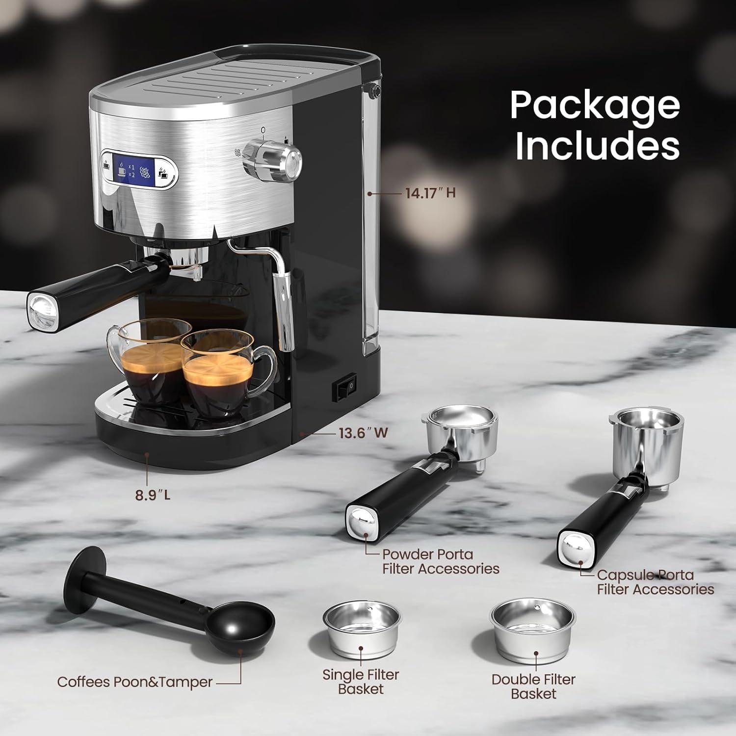 Electactic 20 Bar Semi-Automatic Espresso Machine, Compact Stainless Steel Coffee Maker with LCD Display, Steam Wand, 45oz Removable Water Tank, for Espresso, Cappuccino & Latte at Home or Office