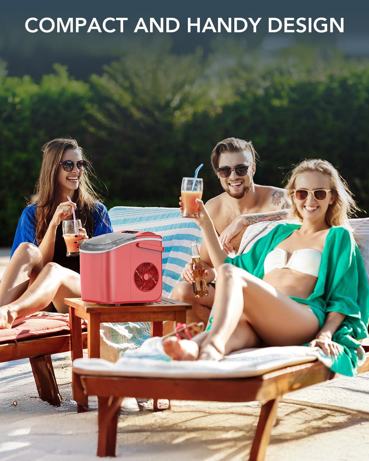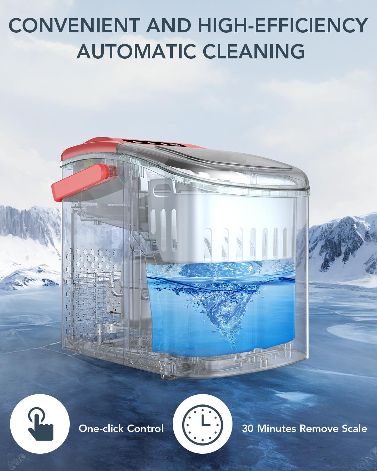 Ice Maker Countertop, Efficient Easy Carry Ice Machine, Self-Cleaning Ice Maker with Ice Scoop & Basket, 9pcs/ 8mins 26.6Lbs Per Day for Home/Office/Kitchen,Green(Red)