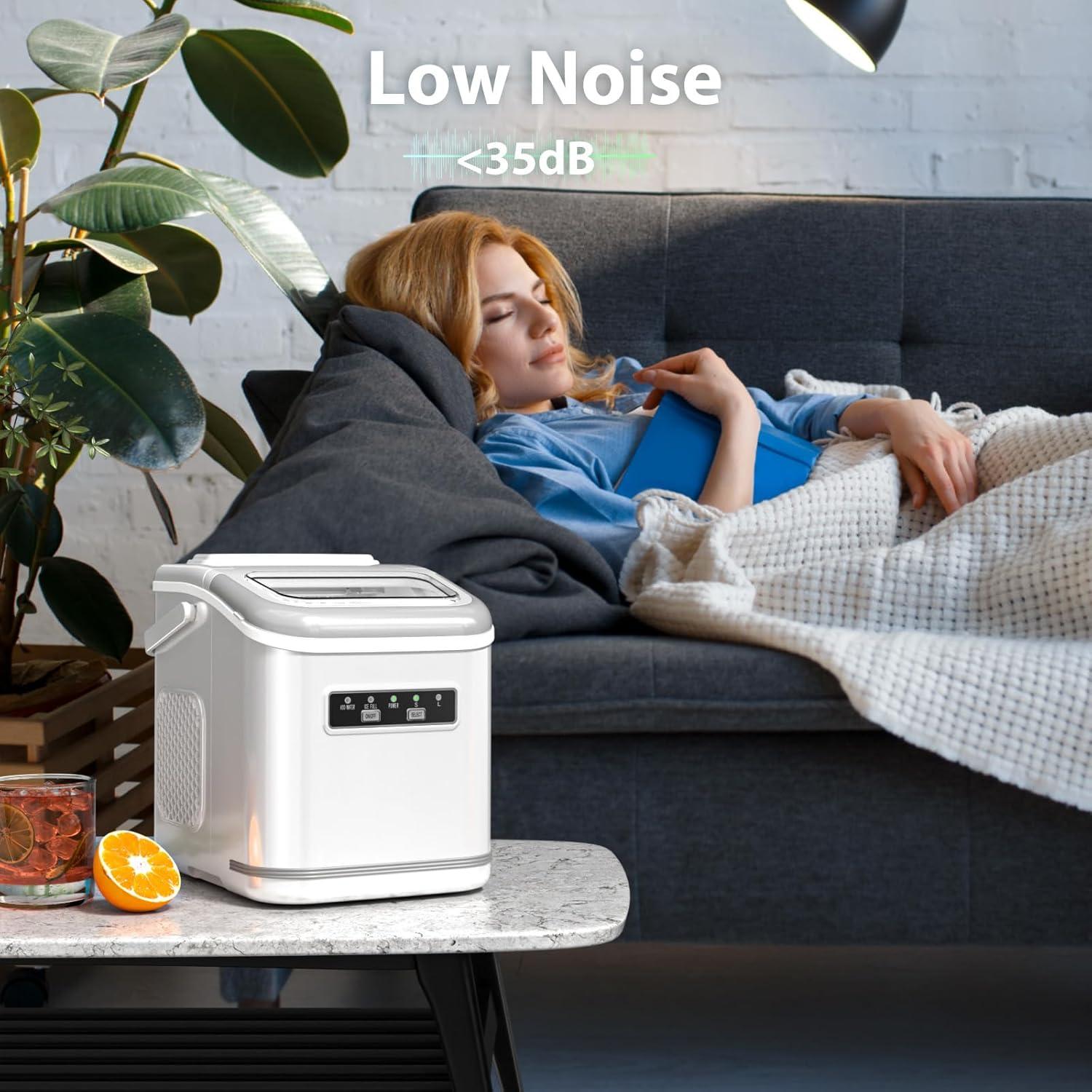 Fast ice making with low noise: 9 ice cubes can be made in 6 minutes at the earliest, a round of ice-making time is about 6-13 minutes. Within 24 hours, 26 pounds of ice can be made. The noise during ice making is lower than 35 dB and it can run quietly