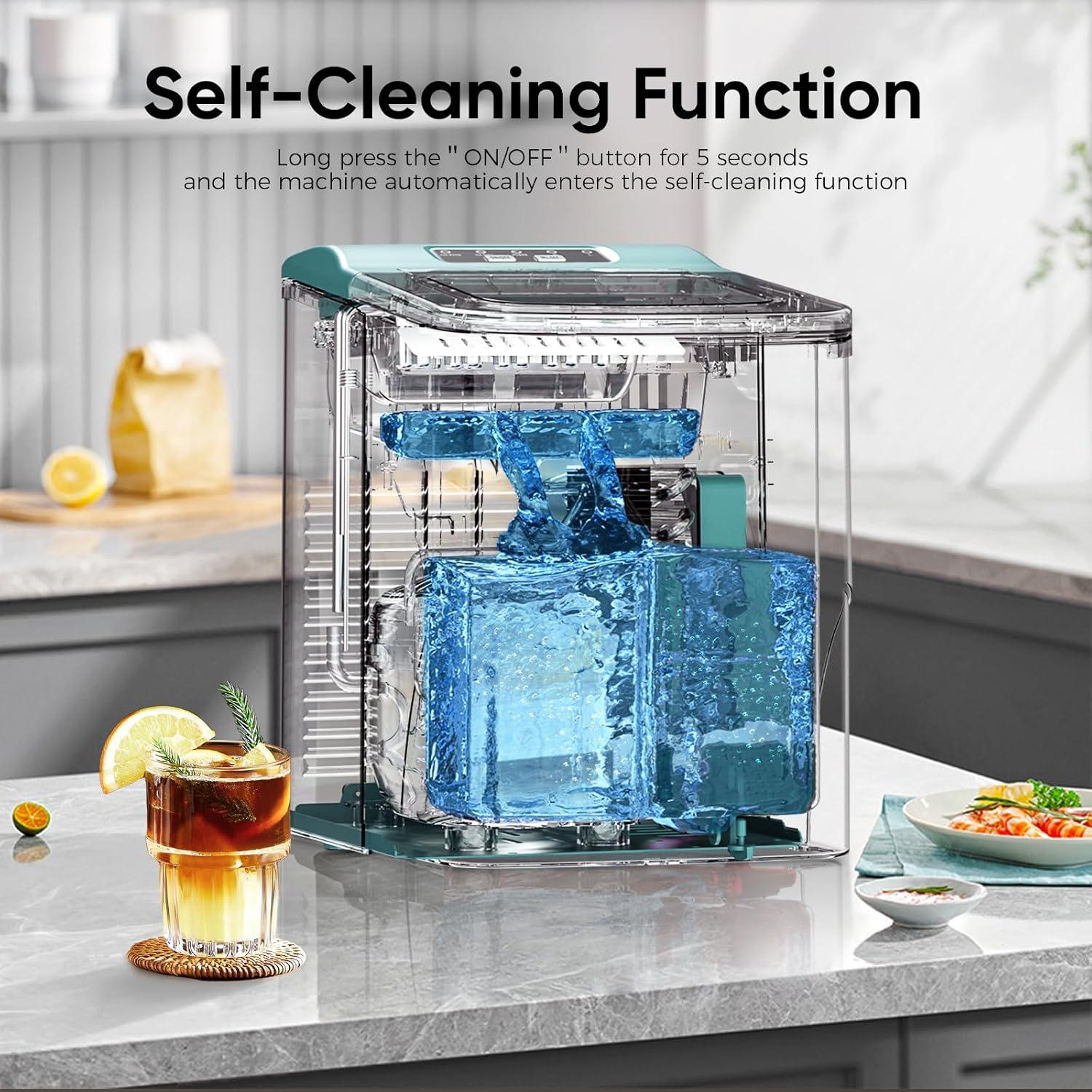 【Self-Cleaning Function】Maintenance is a breeze with the built-in self-cleaning function. Simply press the “on/off”button for 5S to activate it, and the portable ice maker will take care of the rest, ensuring your ice stays pure and your machine runs smoothly
