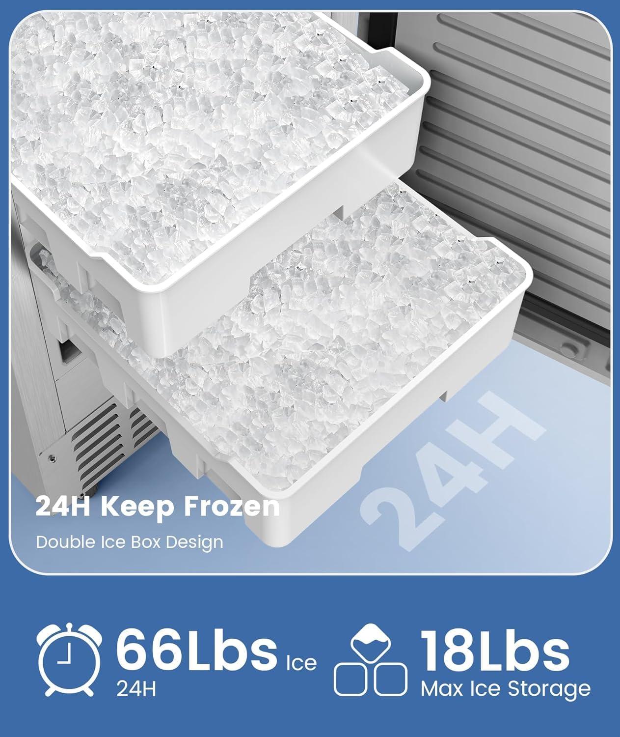 Built-in & Freestanding Design:This flexible under counter nugget ice maker can be installed as a built-in unit or used freestanding. Featuring a stainless steel door, it fits seamlessly into various settings while ensuring durability and easy maintenance