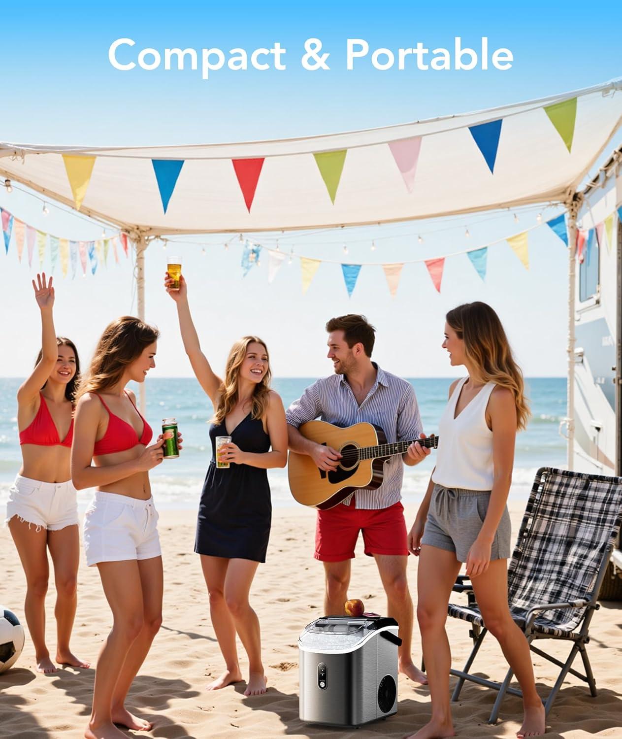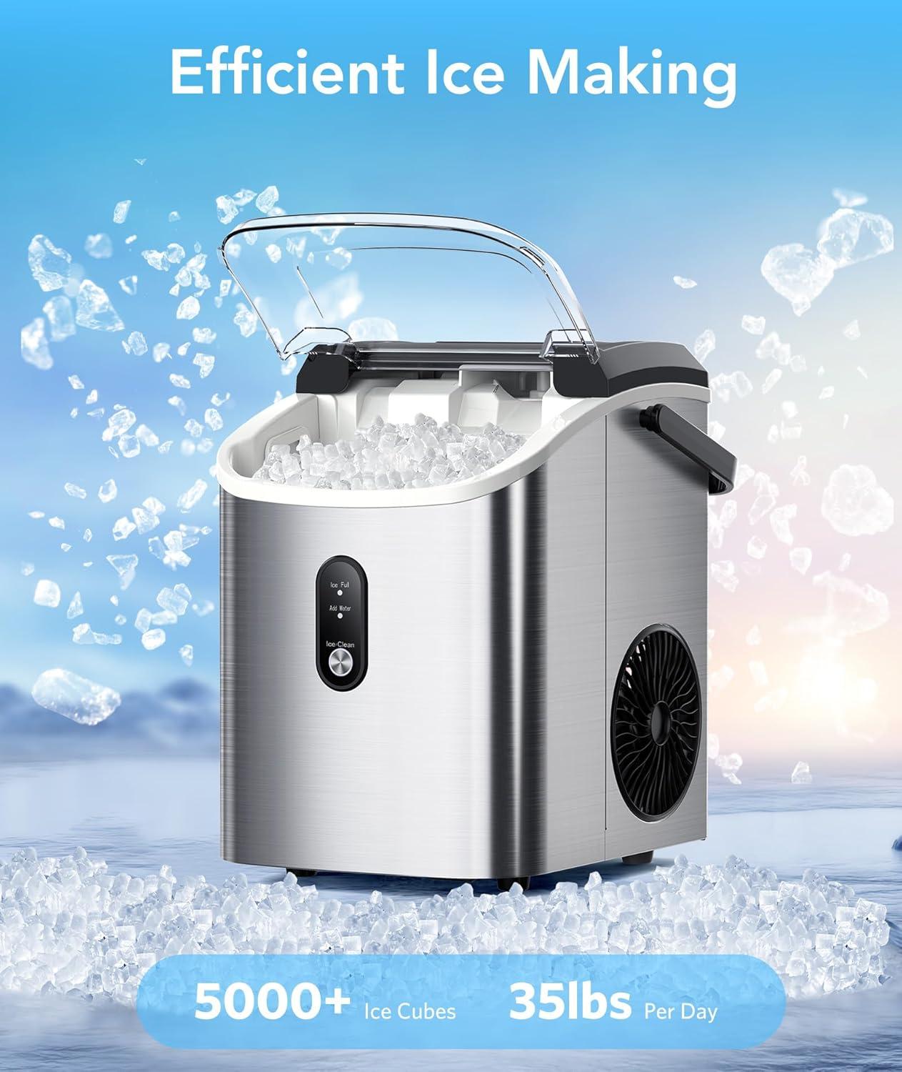 High-Efficiency Ice Production: Our countertop ice maker creates chewable nugget ice in 6 mins, yields 35 lbs/day, and includes a basket & scoop for continuous supply. Say goodbye to the problem of insufficient parties/events production due to slow ice production