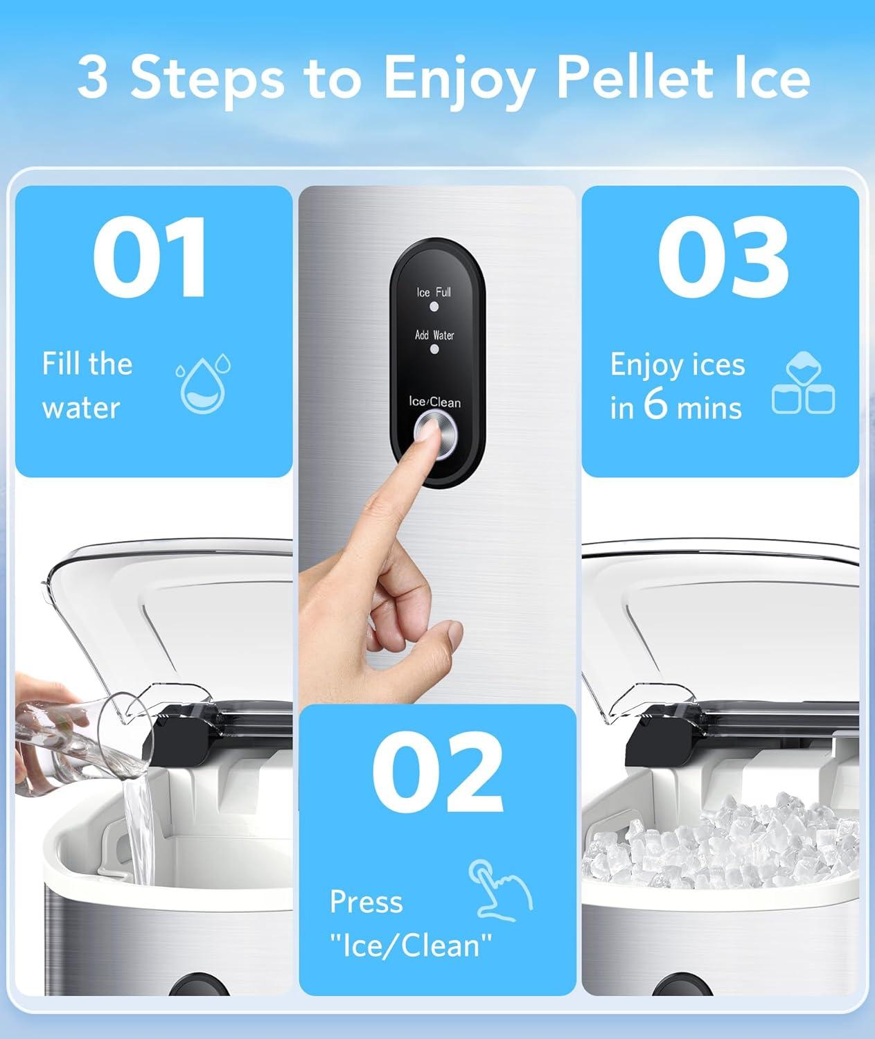 Whisper-Quiet & Self-Cleaning Function: This crushed pellet ice maker operates at 43 dB, features smart LED indicators for “Ice Full”/“Add Water,” and offers one-touch self-cleaning + a lift-top for deep cleaning. Say goodbye to the annoyance of loud electrical noise that affects work/life and the tedious manual maintenance